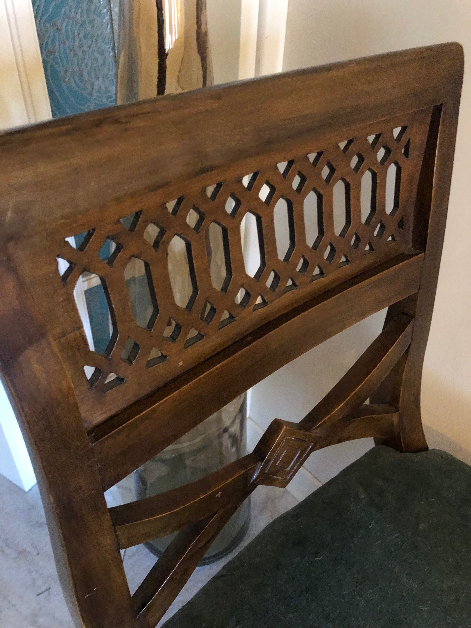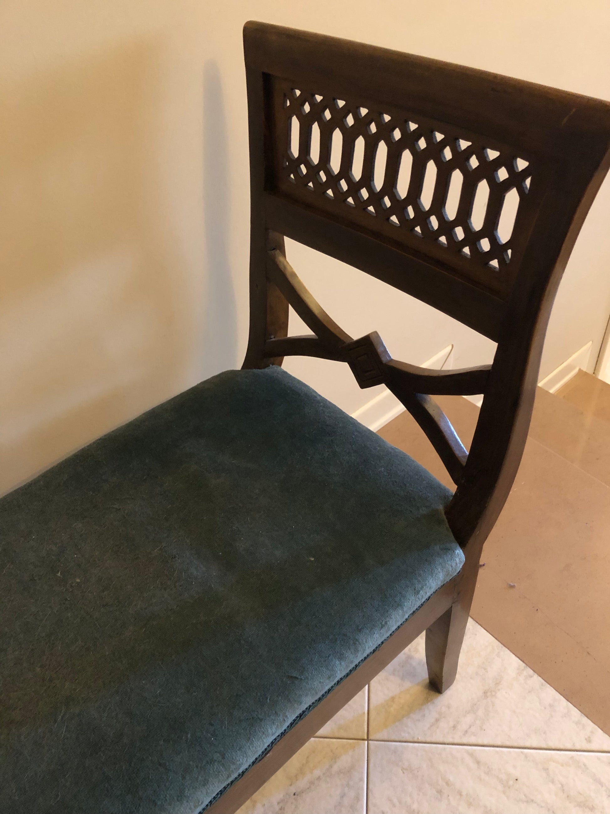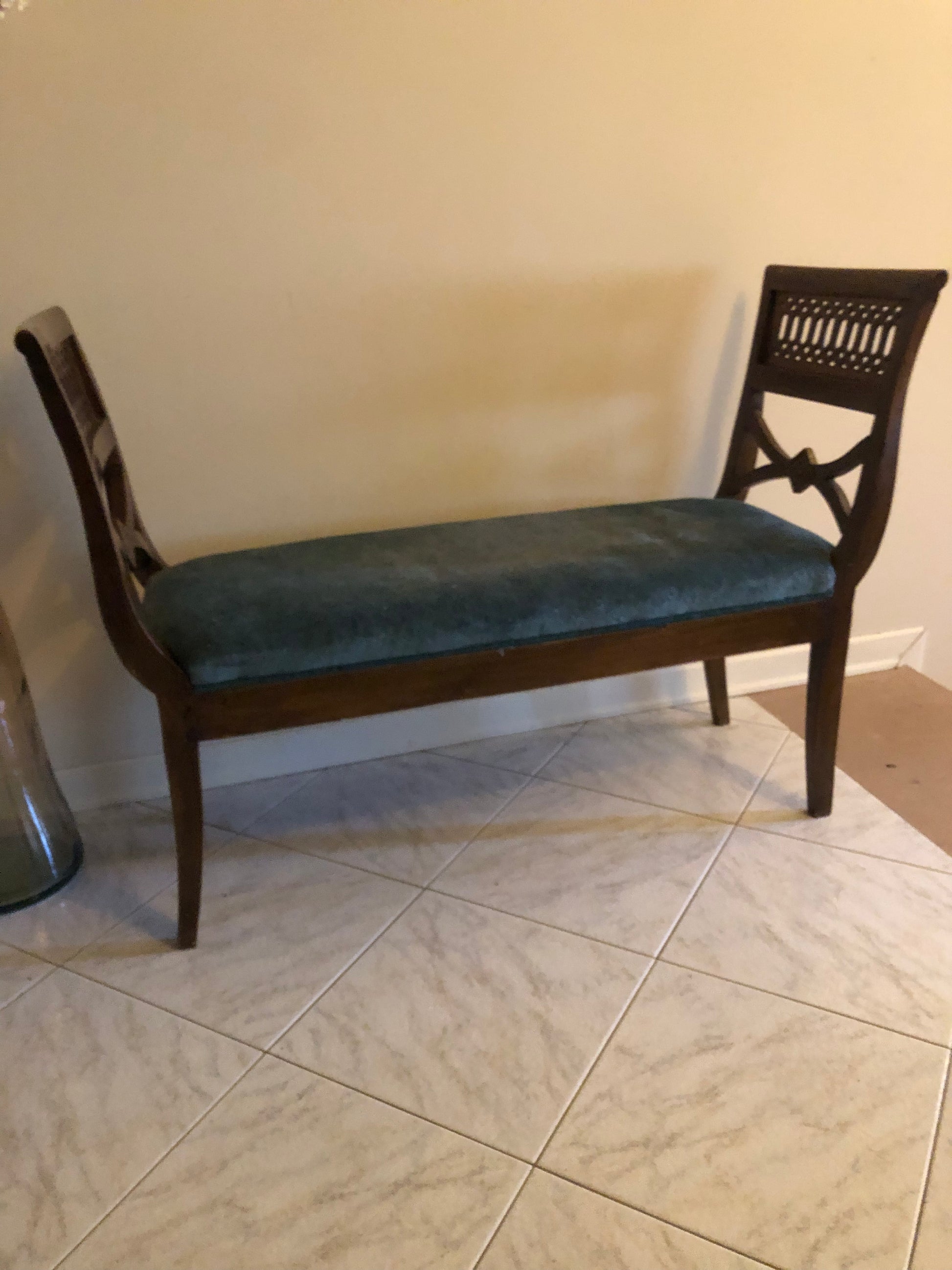 Piccola panchetta/divanetto epoca primi 900 intarsiata in noce massiccio, la seduta imbottita e rivestita in velluto blu originale. E' resa particolare dai braccioli laterali scolpiti con motivo classico del periodo Luigi XVI