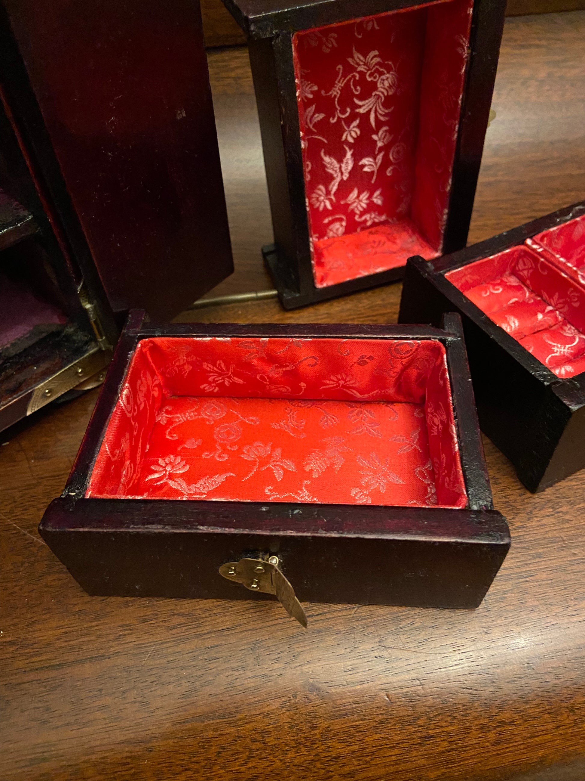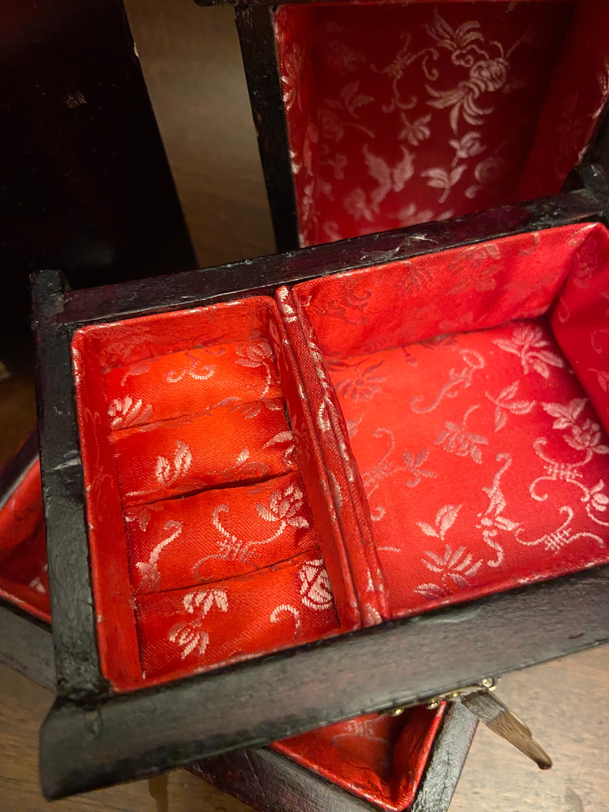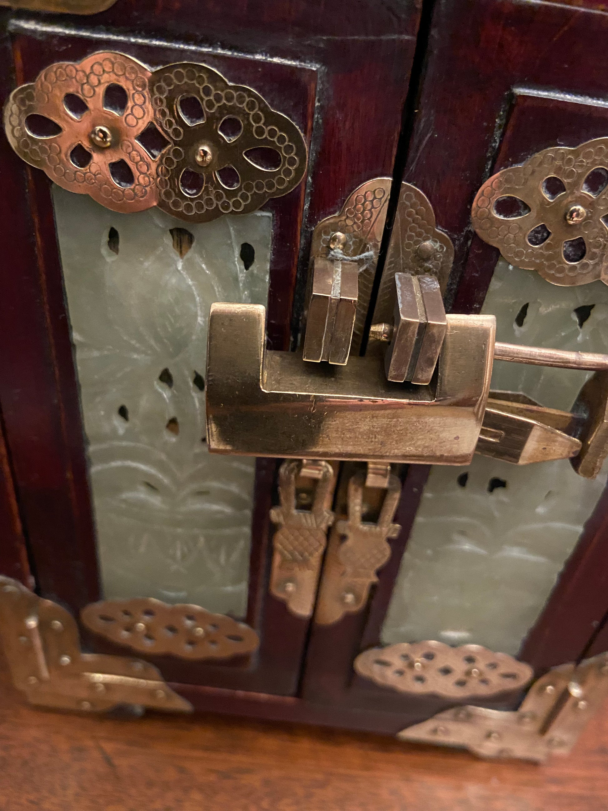 Bellissimo oggetto da collezione. Trattasi di un portagioielli realizzato in palissandro con intarsi in giada.